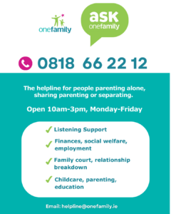 You can call the askonefamily helpline on 0818 662 212 or 01 662 9212, or email your query to helpline@onefamily.ie.